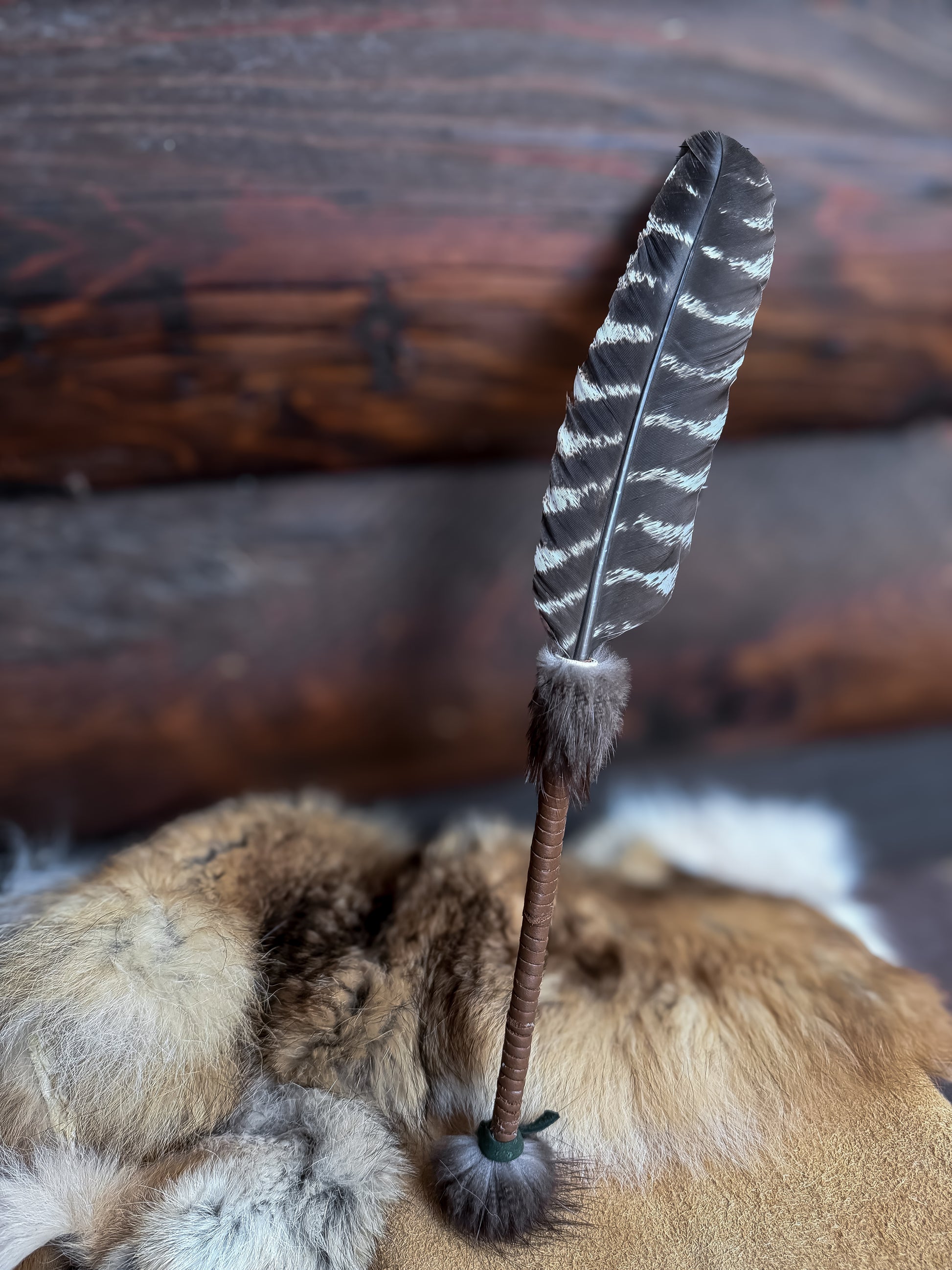 A single wild turkey feather paired with genuine beaver fur and tobacco-toned buckskin, finished with a small green buckskin leather accent. Grounded and steady, this fan carries prayers of nourishment, patience, and connection to the land.